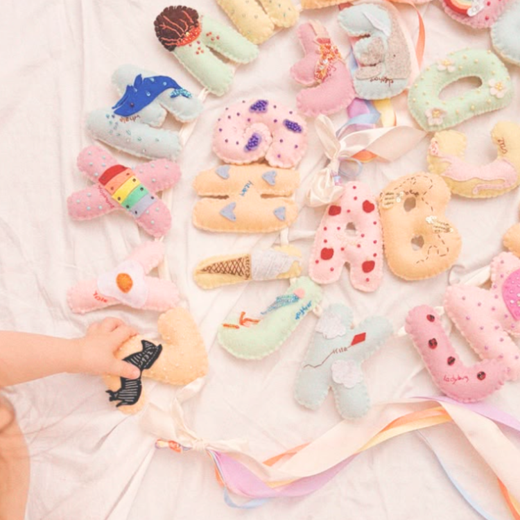 A statement and learning piece designed to be enjoyed for years. Available plain in pastel felt, or embellished, where each letter features its own playful motif (A for apples, B for bees, etc.). Handmade with care to add charm and personality to any space.